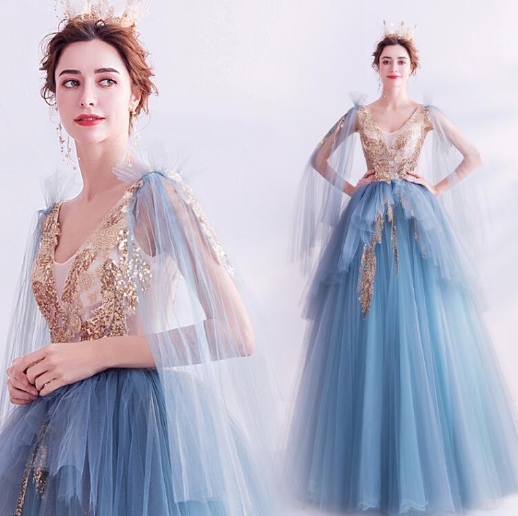 ステージ 衣装 演奏会用ドレス ロングドレス プリンセスラインドレス ウエディングドレス 長袖 花嫁 二次会 結婚式 成人式 フォーマルドレス 舞台 パーティードレス 発表会 カラードレスふわふわスカート 刺繍 編み上げ ライトブルー/ブルー/白/パープル/ピンク/イエロー