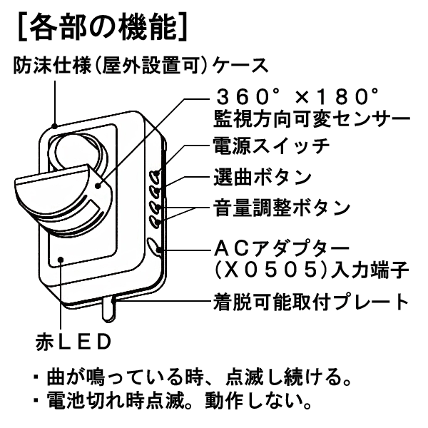 ●感知すると赤LEDが点滅しながら、選んだチャイム音、曲、アラーム音が 一定時間(5秒〜30秒間、選曲した曲により長さが異なります)流れます。