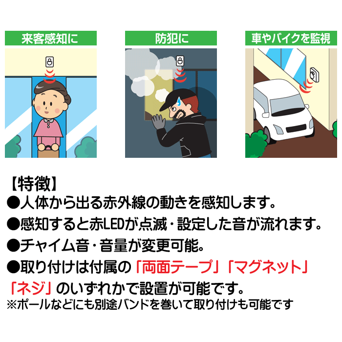 《詳しくはこちらをご確認ください》[60サイズ] オススメセット品 スポット人感チャイム+ACアダプターセット 屋内取り付けにオススメ。