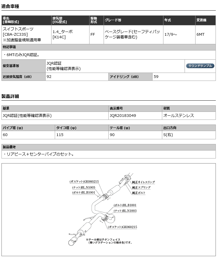 【 スイフトスポーツ 1.4Lターボ車 2WD車 6MT車 型式 CBA-ZC33S/4BA-ZC33S エンジン K14C 年式 2017/9- ベースグレード/セーフティパッケージ可 ≪ テール:90Φ リアピース+センターパイプセット ≫≪ S44348 ≫】 柿本改マフラー 【 GTbox 06&Sマフラー 】
