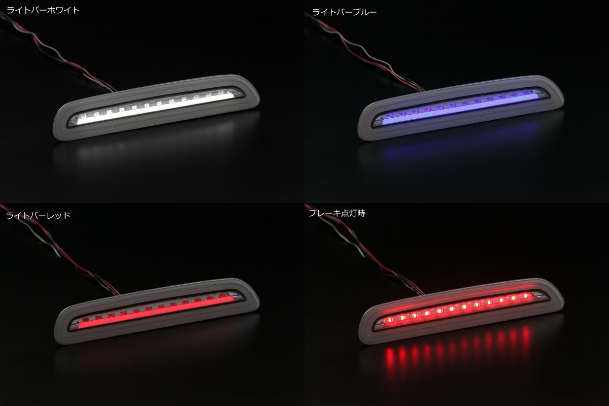 適応車種 【TOYOTA】 200系 ハイエース 6型 7型 2020年5月一部改良後 【MAZDA】 ボンゴブロニーイバン 2020年6月25日一部改良後 【純正ハイマウント(センターストップランプ)装着車専用】 ※リアカメラ車装着不可 ※5型までの車両はカプラー形状が異なります 商品内容 -LEDライトバースタイル- ポジション等に連動可能なLEDライトバー付き。